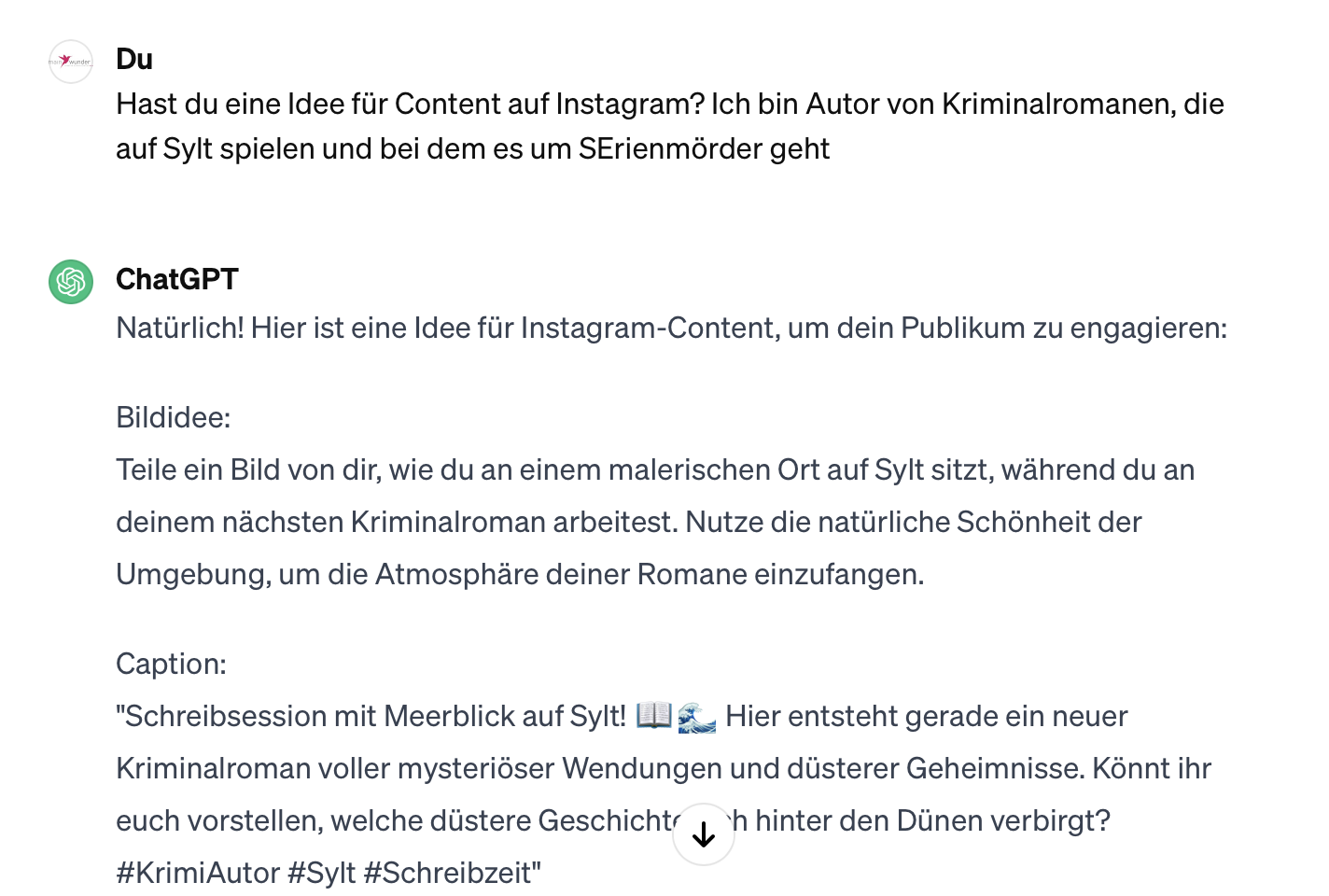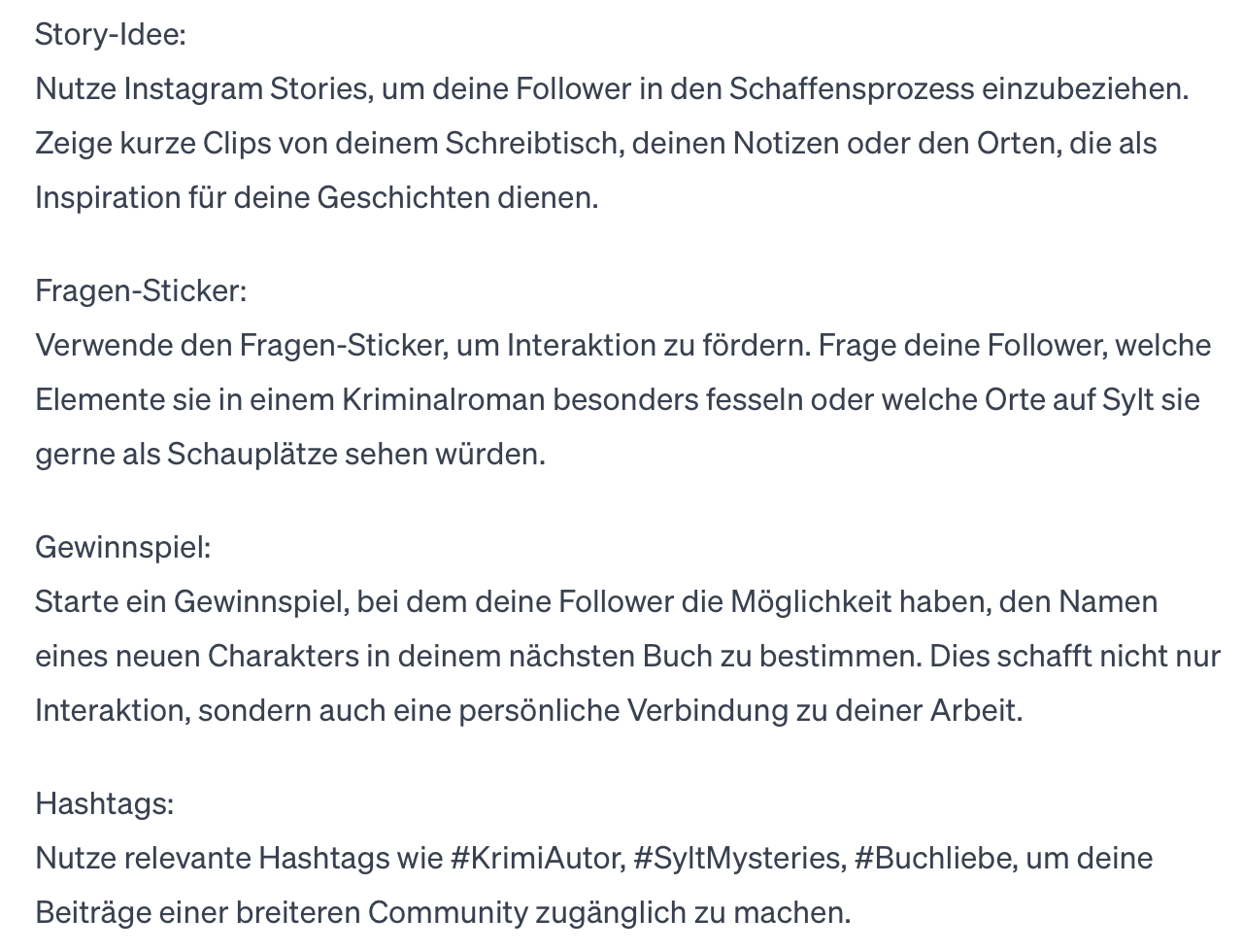 Du wirst sehen, da kommen wirklich gute Ideen für Posts, Stories und Captions! Aber Achtung: Die KI übertreibt gerne etwas, sage ihr dann, dass sie z.B. weniger blumig oder übertrieben kitschig schreiben soll. Lust auf ein Beispiel? Here we go!
